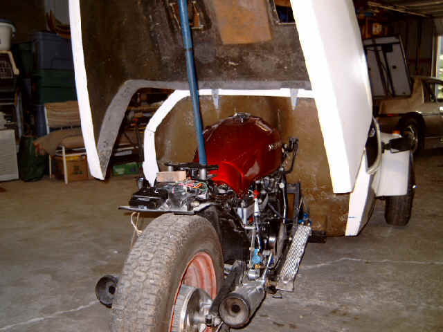 Some pics of my just completed FireAero. I will paint it after I work out any changes. It goes to the state police next week for approvals for registration. 8/21/04 It's Gen 1 with a Honda V45 Sabre for power. John Brecher